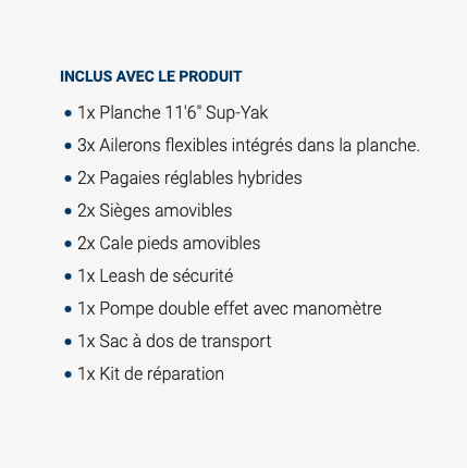 Le Sup-Yak 10'6'' est un pack gonflable SUP/Kayak “2 en 1” stable, léger et facile à utiliser. Avec une charge maximale de 200 kg, il offre un volume important pour emmener un enfant, et/ou un animal et/ou du matériel. Avec sa largeur confortable, son arrière large et son avant affiné, il est stable passe le clapot en douceur avec une bonne glisse. Le design innovant allie confort et facilité d’utilisationpour passer de bons moments sur l'eau en famille et avec des amis, que ce soit debout, assis ou allongé. Choisissez l'emplacement du siège de kayak, du repose-pieds, de l'élastique de pont et d'autres accessoires ou enlevez tous les accessoires et profitez d'une zone de pont confortable et libre pour le paddle, le yoga et la détente.
